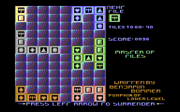 Master of Tiles is a simple puzzle board game for for the Commodore c64 and 1 player. The game was written by the Benjamin (Pumpkin) Bommer, back in the early 1990s, but never actually got released until now.